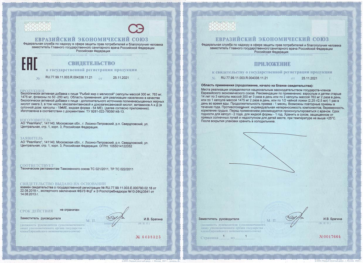 БАД к пище «Рыбий жир с мелиссой» зарегистрирована Федеральной службой по надзору в сфере защиты прав потребителей и благополучия человека. Свидетельство о государственной регистрации № RU.77.99.11.003.E.000790.02.18 от 22.02.2018 года ТУ 9281-022-78056148-13.