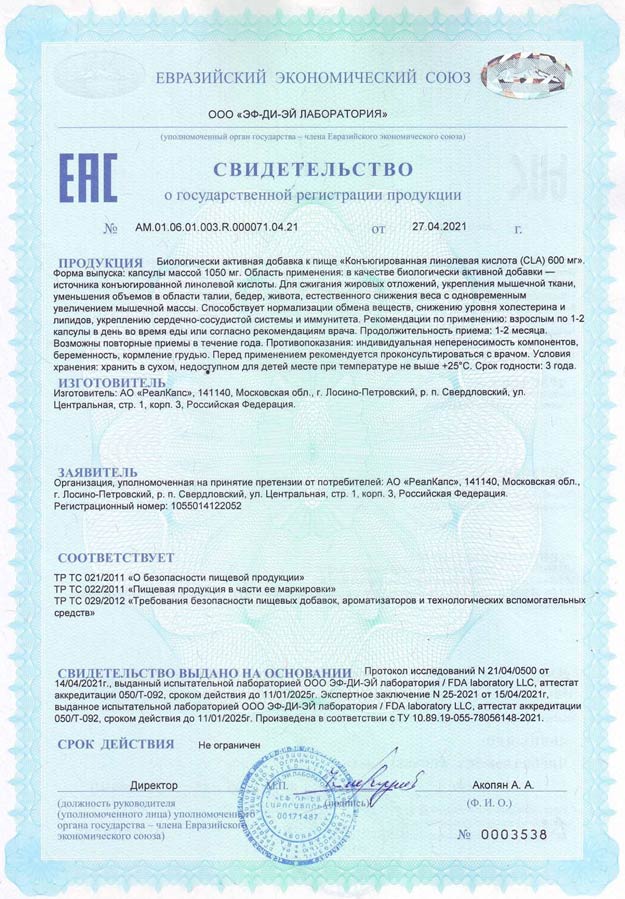 Свидетельство о государственной регистрации № AM.01.06.01.003.R.000071.04.21 от 27.04.2021 г, ТУ 10.89.19-055-78056148-2021.