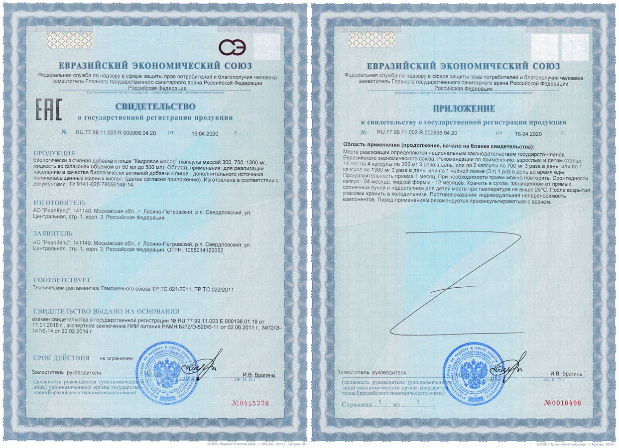 Биологически активная добавка к пище «Кедровое масло» зарегистрирована Федеральной службой по надзору в сфере защиты прав потребителей и благополучия человека. Свидетельство о государственной регистрации № RU.77.99.11.003.Е.000136.01.18 от 17.01.2018 года, ТУ 9141-020-78056148-14.
