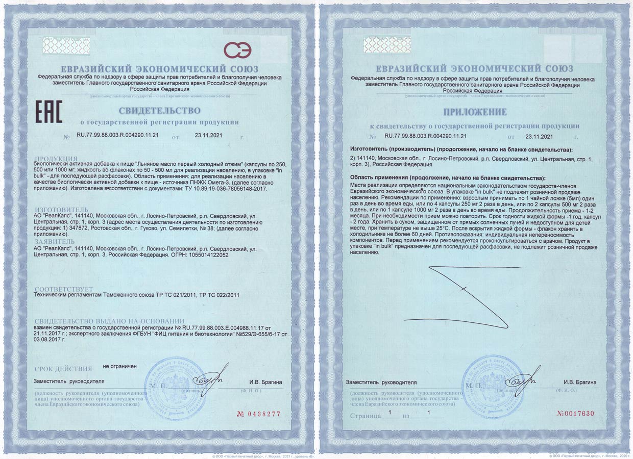 Биологически активная добавка к пище «Льняное масло» в капсулах (250мг, 500мг, 1000мг) зарегистрирована Федеральной службой по надзору в сфере защиты прав потребителей и благополучия человека. Свидетельство о государственной регистрации № RU.77.99.11.003.Е.004988.11.17 от 21.11.2017 года, ТУ 9141-016-78056148-14.