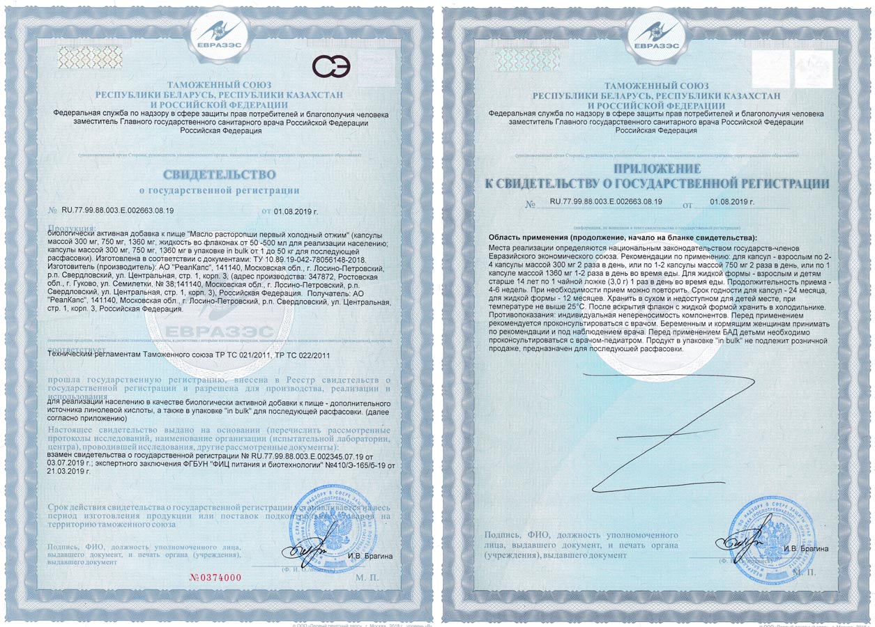 «Масло расторопши» зарегистрировано Федеральной службой по надзору в сфере защиты прав потребителей и благополучия человека. Свидетельство о государственной регистрации № RU.77.99.11.003.Е.002663.08.19 от 01.08.2019 года, ТТУ 10.89.19-042-78056148-2018.