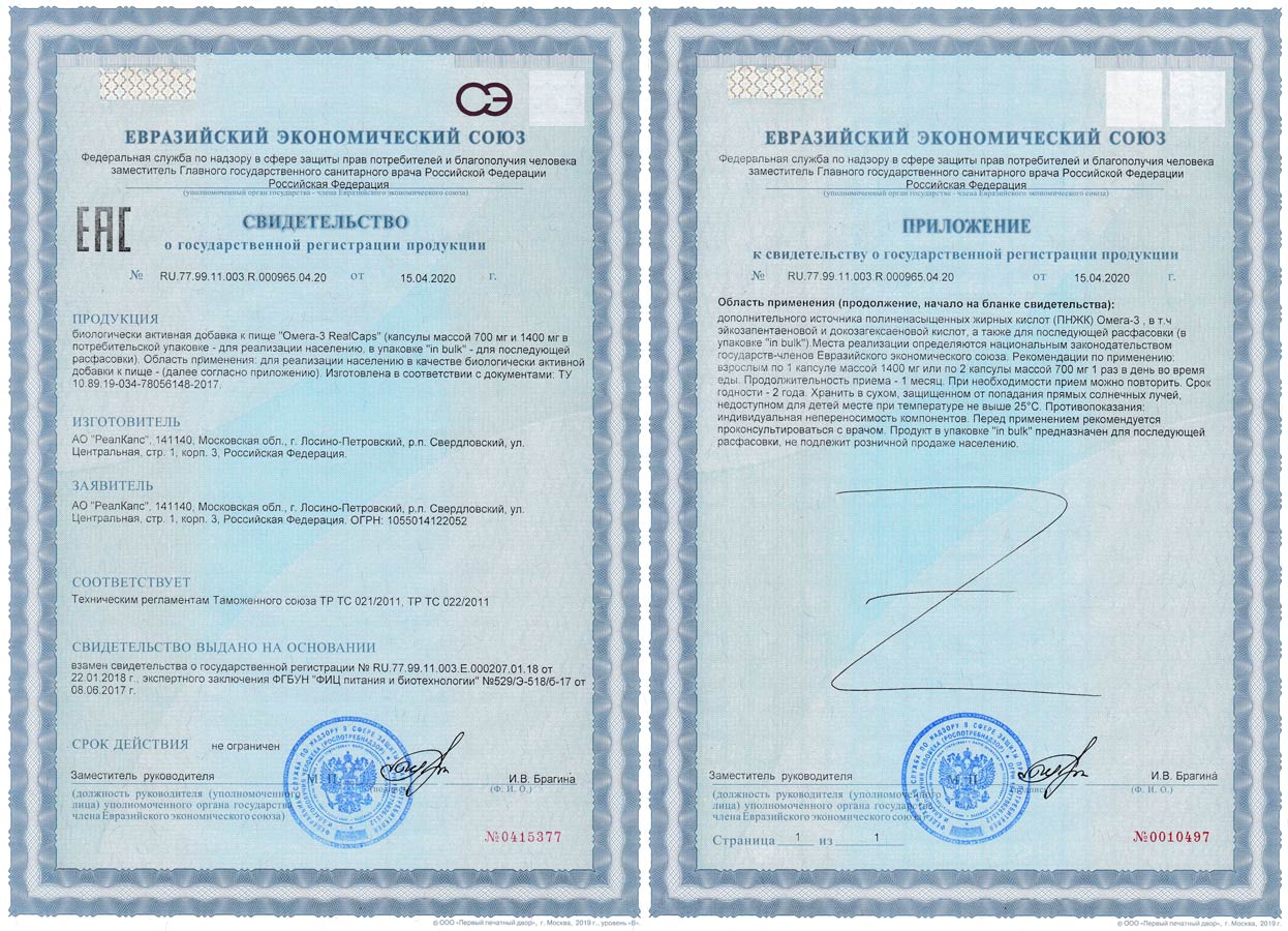 БАД к пище «Омега-3 RealCaps» зарегистрирован Федеральной службой по надзору в сфере защиты прав потребителей и благополучия человека. Свидетельство о государственной регистрации № RU.77.99.11.003.E.000207.01.18 от 22.01.2018 года, ТУ 10.89.19-034-78056148-2017.