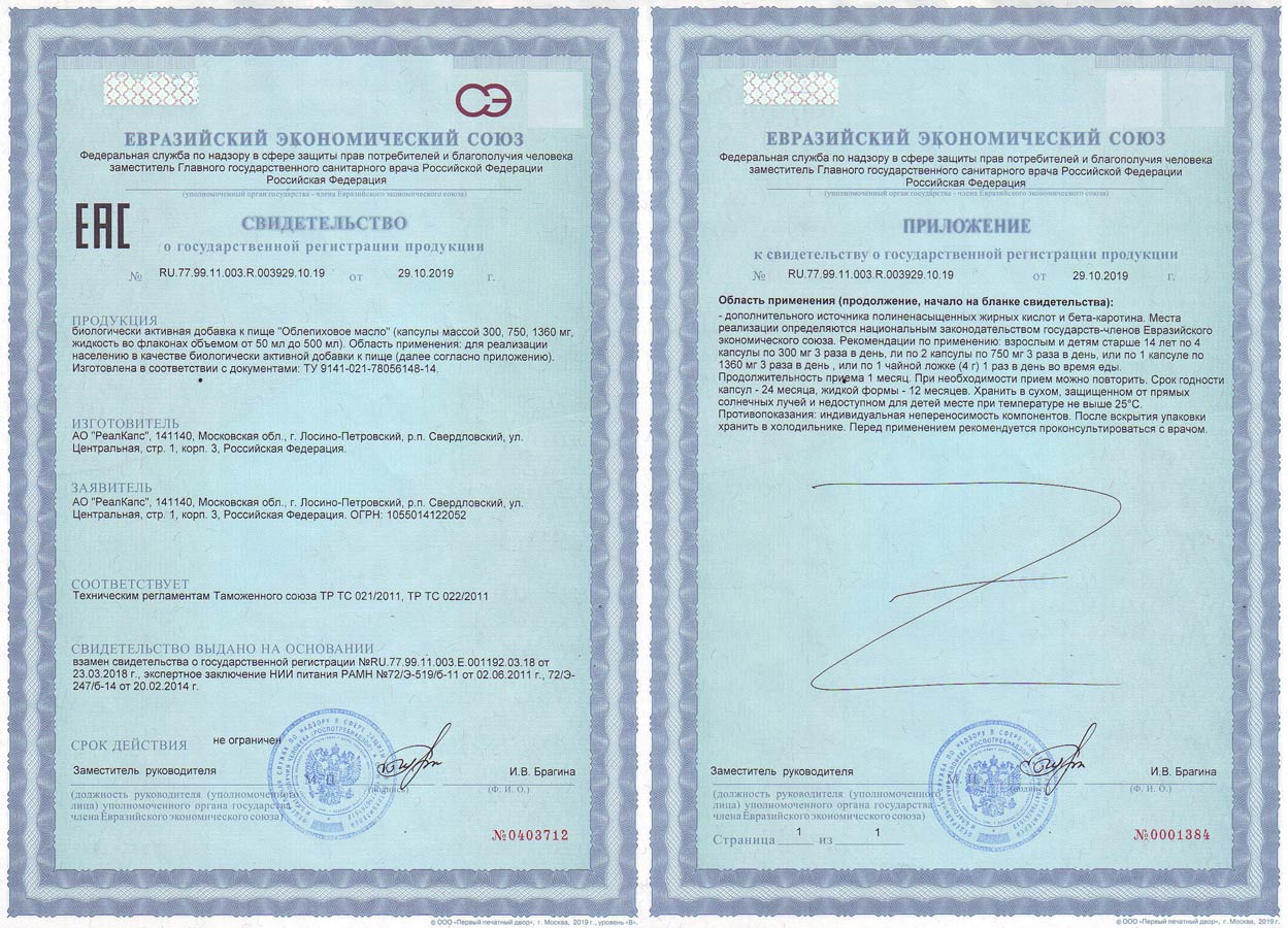 Биологически активная добавка к пище «Облепиховое масло» зарегистрировано Федеральной службой по надзору в сфере защиты прав потребителей и благополучия человека. Свидетельство о государственной регистрации № RU.77.99.11.003.R.003929.10.19 от 29.10.2019 года, ТУ 9141-021-78056148-14.