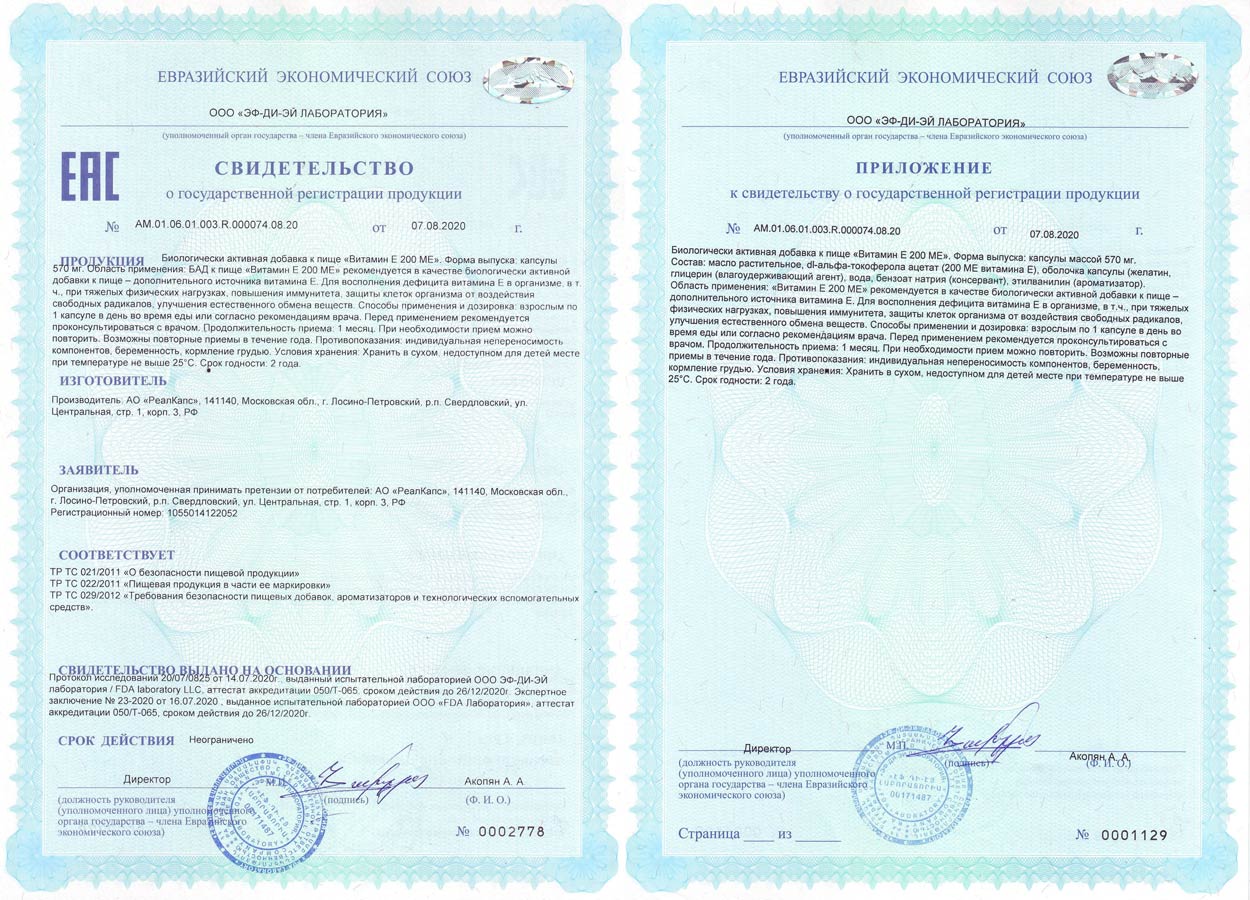 Биологически активная добавка к пище «Витамин Е 200 МЕ»: Свидетельство о государственной регистрации № AM.01.06.01.003.R.000074.08.20 от 07.08.2020, ТУ 10.89.19-053-78056148-2020.