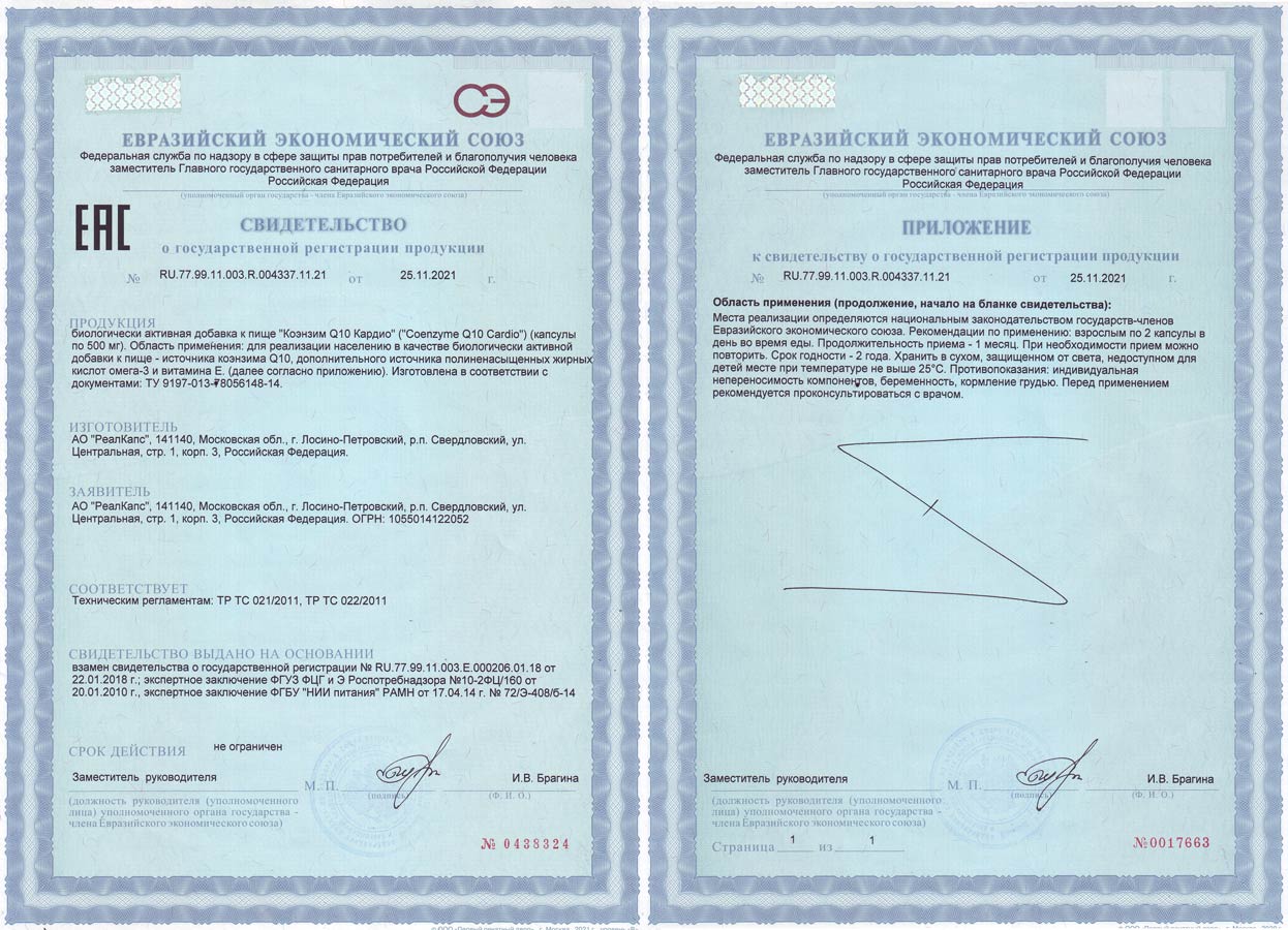 Биологически активная добавка к пище "Коэнзим Q10 Кардио (Coenzyme Q10 Cardio)" зарегистрирована Федеральной службой по надзору в сфере защиты прав потребителей и благополучия человека. Свидетельство о государственной регистрации N 77.99.11.003.Е.000206.01.18 от 22.01.2018 года, ТУ 9197-013-78056148-14.