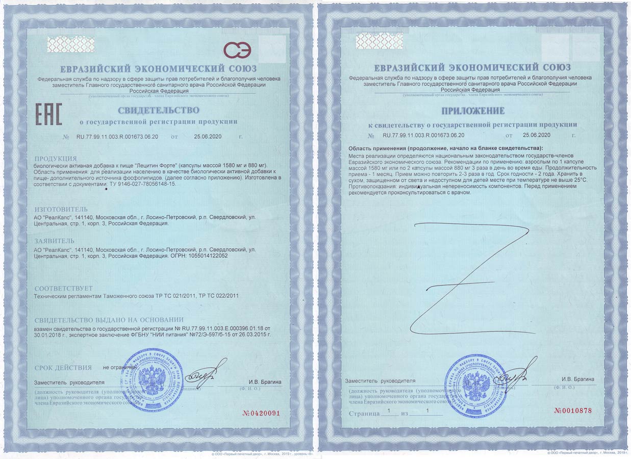 Биологически активная добавка к пище «Лецитин Форте» зарегистрирована Федеральной службой по надзору в сфере защиты прав потребителей и благополучия человека. Свидетельство о государственной регистрации № RU.77.99.11.003.E.000396.01.18 от 30.01.2018 года, ТУ 9146-027-78056148-15.