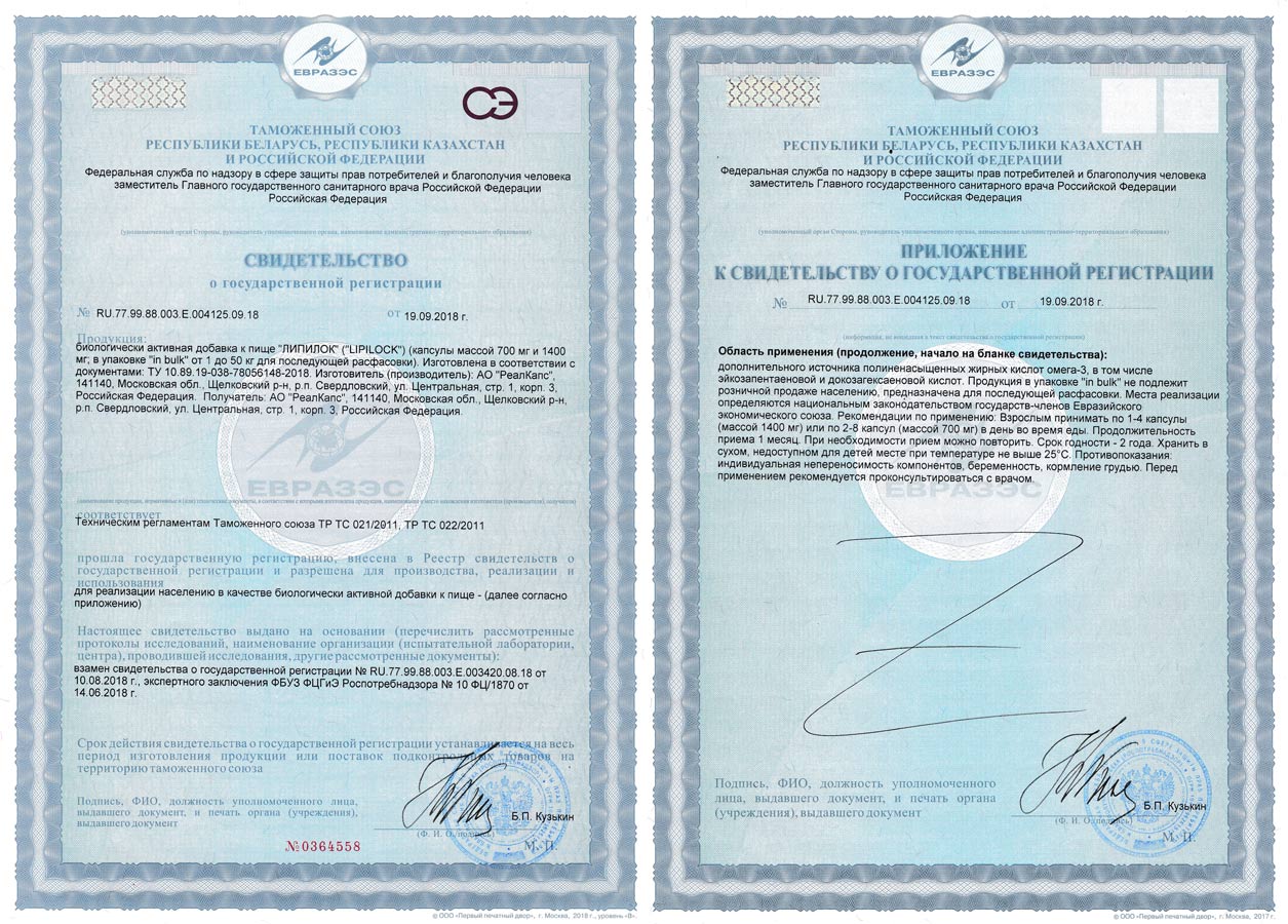 БАД к пище «ЛИПИЛОК®» зарегистрирована Федеральной службой по надзору в сфере защиты прав потребителей и благополучия человека. Свидетельство о государственной регистрации RU.77.99.88.003.Е.004125.09.18 от 19.09.2018 года ТУ 10.89.19-038-78056148-2018.