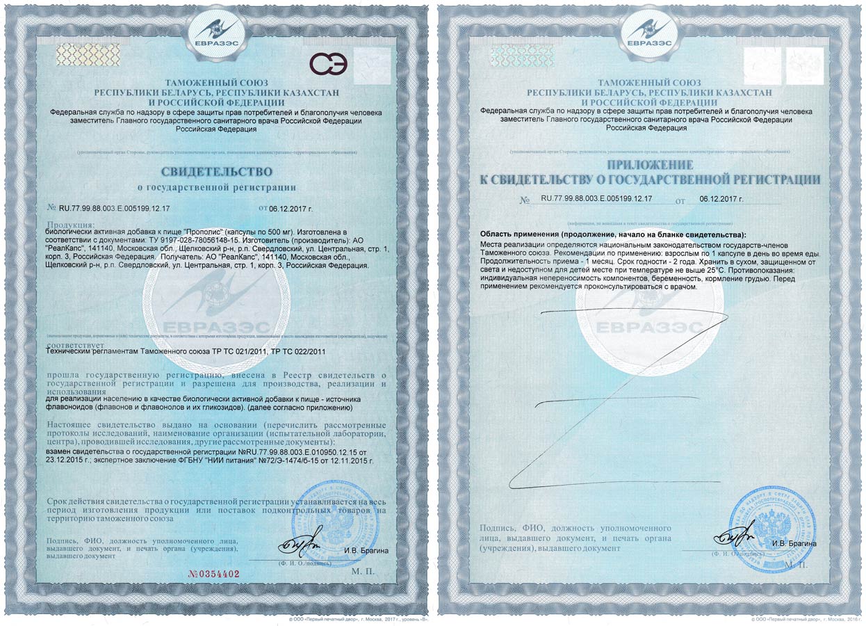 Биологически активная добавка к пище «Прополис» зарегистрирована Федеральной службой по надзору в сфере защиты прав потребителей и благополучия человека. Свидетельство о государственной регистрации № RU.77.99.88.003.Е.005199.12.17 от 06.12.2017 года, ТУ 9197-028-78056148-15.