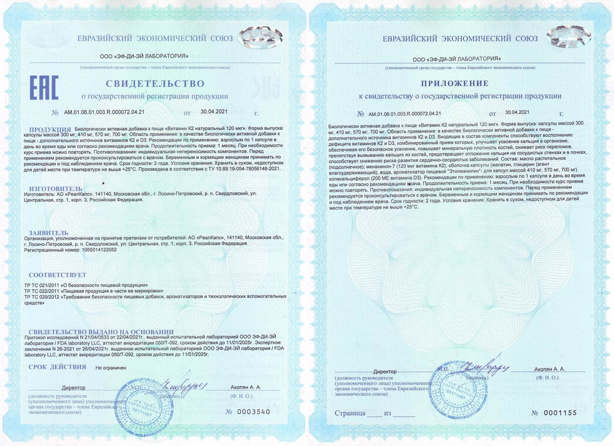 Для производства биологически активной добавки к пище «Витамин К2 натуральный 120 мкг» используется натуральный витамин К2 в форме менахинона-7, который получают методом естественной ферментации с использованием субстрата из порошка нута. Эффективность и безопасность сырья доказана клиническими исследованиями.